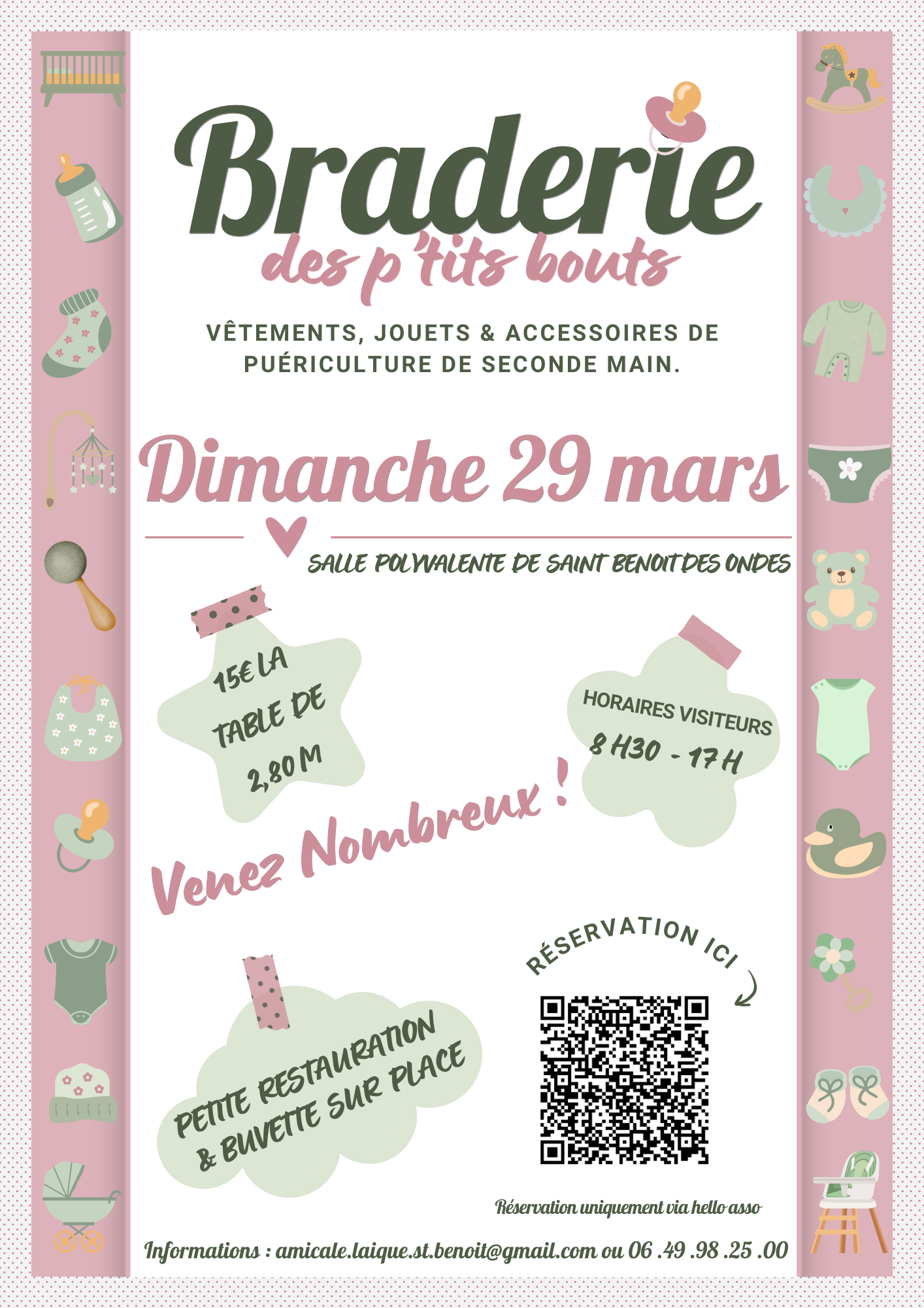 L’Amicale Laïque de Saint-Benoît-des-Ondes organise sa braderie des p’tits bouts le dimanche 29 mars 2026 à la salle polyvalente.