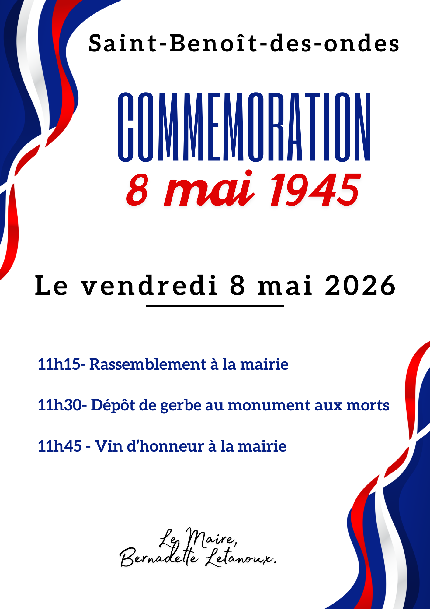 Le Conseil Municipal et les anciens combattants vous convient à la cérémonie de Commémoration de la Victoire du 8 mai 1945.