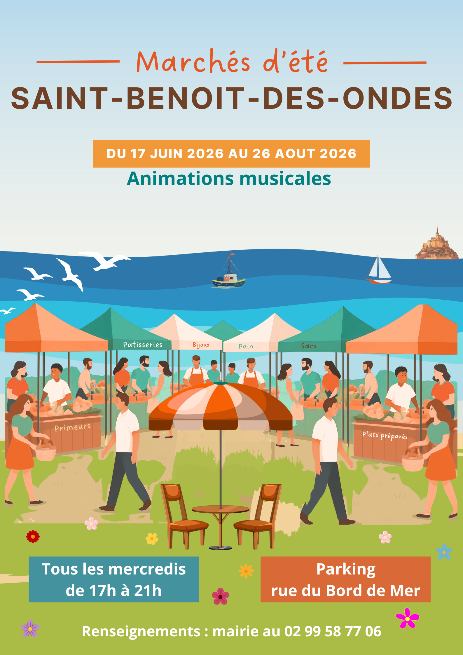Les marchés débuteront du 17/06/2026 jusqu’au 26/08/2026. Ils se tiendront rue du Bord de Mer, sur la grève, les mercredis de 17h00 à 21h00.