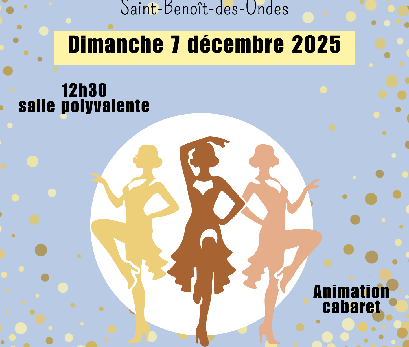 Dimanche 7 décembre 2025 à 12 h 30, à la salle polyvalente, un repas avec une animation cabaret est offert, par le Centre Communal d’Action Sociale, aux personnes de 70 ans et plus (au 31/12/2025) domiciliées à à Saint-Benoît-des-Ondes.
