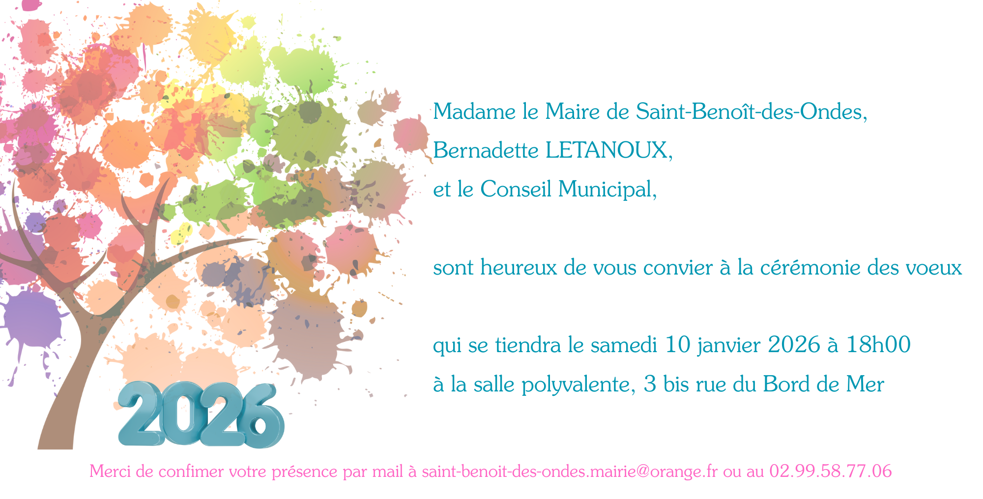 Madame le Maire et le Conseil Municipal vous convient à la traditionnelle cérémonie des Voeux, qui se déroulera le samedi 10 janvier à 18h00, à la salle polyvalente 3 bis rue du Bord de Mer.