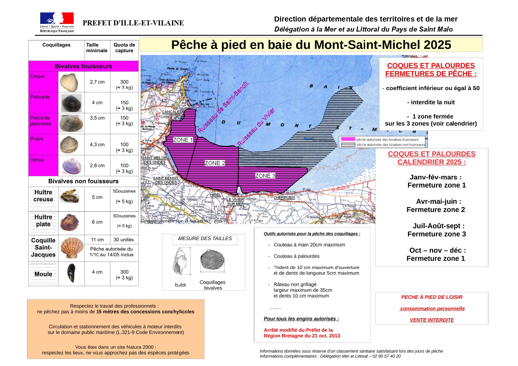 Côté breton de la baie du Mont Saint-Michel, il existe plusieurs zones de pêche définies par la Direction Départementale des Territoires et de la Mer (DDTM 35). Les zones 1, 2 et 3 sont délimitées par les ruisseaux de Saint Benoit-des-Ondes et du Vivier-sur-mer.